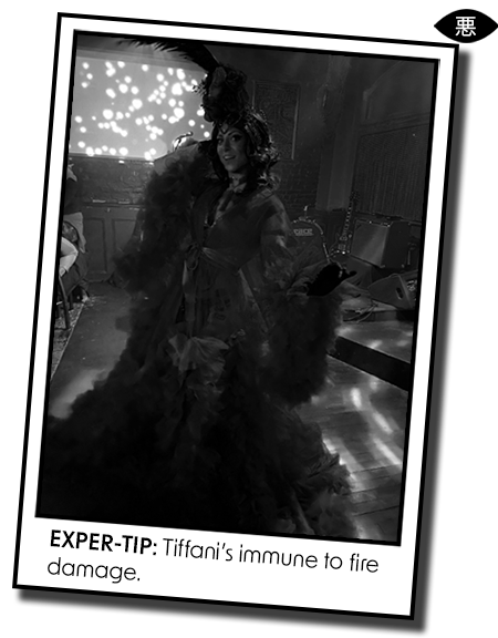 Our host, one Tiffani Monroe, returned. The reddest human I’ve seen outside of Carrie. Tiffani wielded a giant red feather dress over a red bikini in a red-tinted room. She was a full third of a flag-themed USO show. I felt very clever writing that down. Tiffani, like any human that can wear that uniform, had charisma.