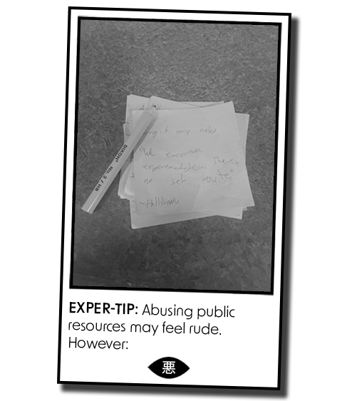 I hadn’t put anything. I tapped the golf pencil against my forehead, saw a flash of pure satanic red, and scrawled two words. I stuck them between a student’s GPA and a parent’s failed business.