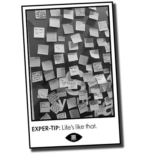 On the way out, I eyed the Wall of Failure. It’s satire in miniature. Disappointments, pratfalls, humblebrags, resentments, accidents, vendettas, and dreams, collected in digestible jokes. My handwriting didn’t stand out, but I could spy my entry from another state. Two simple words: